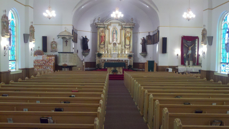 There was a four-room City Hall, a six-room elementary school, several abandoned buildings and a few houses and this large red-gray brick church building with a mission bell at the top of the front façade. A chain-link fence surrounded the manicured lawn. Large shade trees were on the south part of the yard. A man of Hispanic descent was talking on a cell phone and walking around. We got out and took pictures of the ghostly little village, abandoned and condemned out-buildings. The man ended his call and asked us if we wanted to go inside the church. Yes, we did.