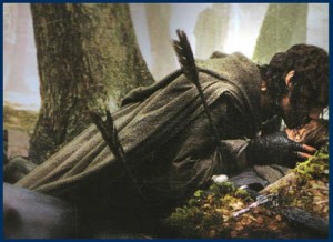 As he lies dying the once and future king—the true king of Middle Earth, Aragorn, rushes to his aid and fights off the Orcs and goblins. When he has won the field, Aragorn kneels down to lend comfort to the mortally wounded Boromir.