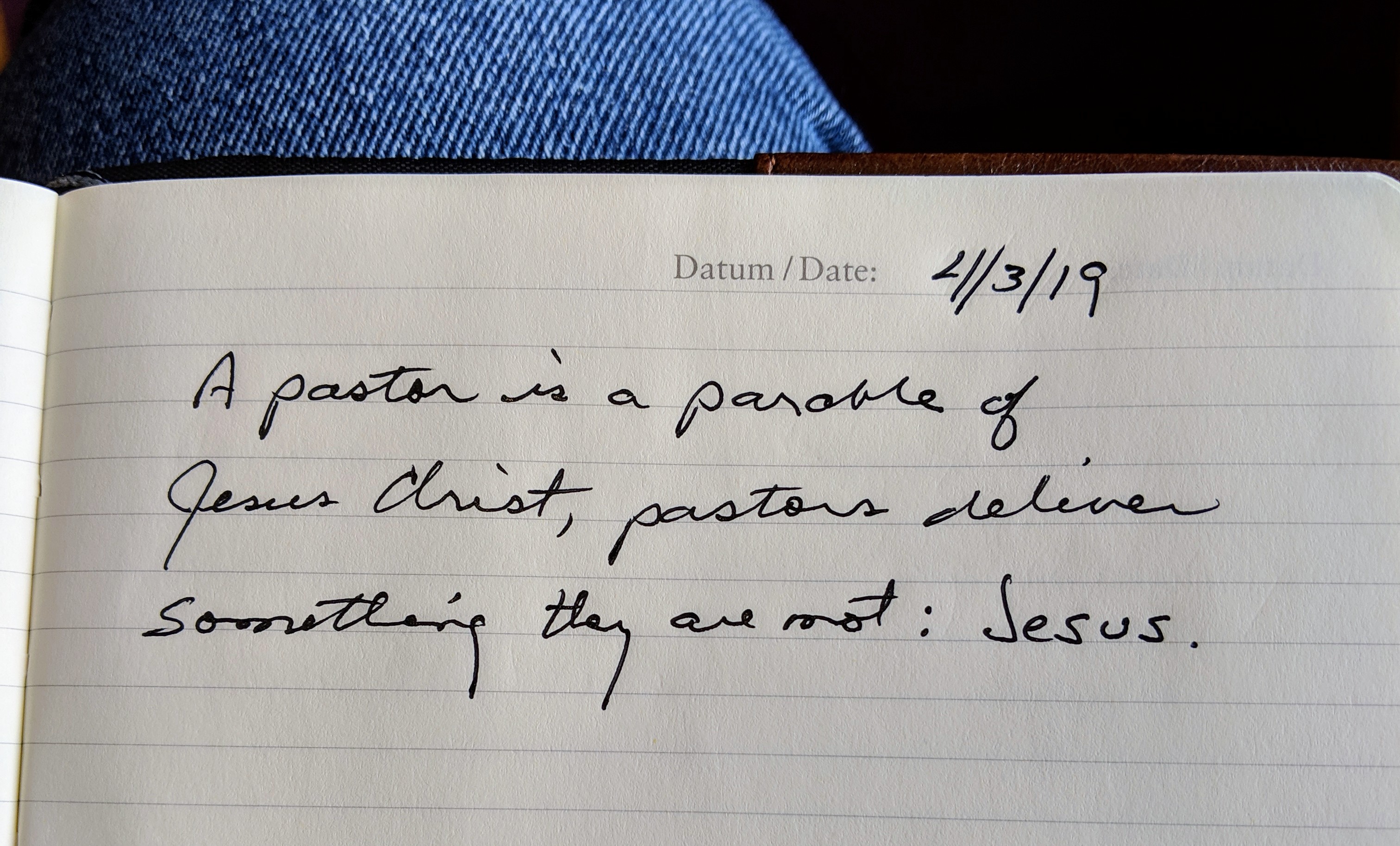 My friend, David Hansen, has a marvelous line in his book, The Power of Loving Your Church, that I placed carefully in my journal: A pastor is a parable of Jesus Christ, pastors deliver something they are not: Jesus.