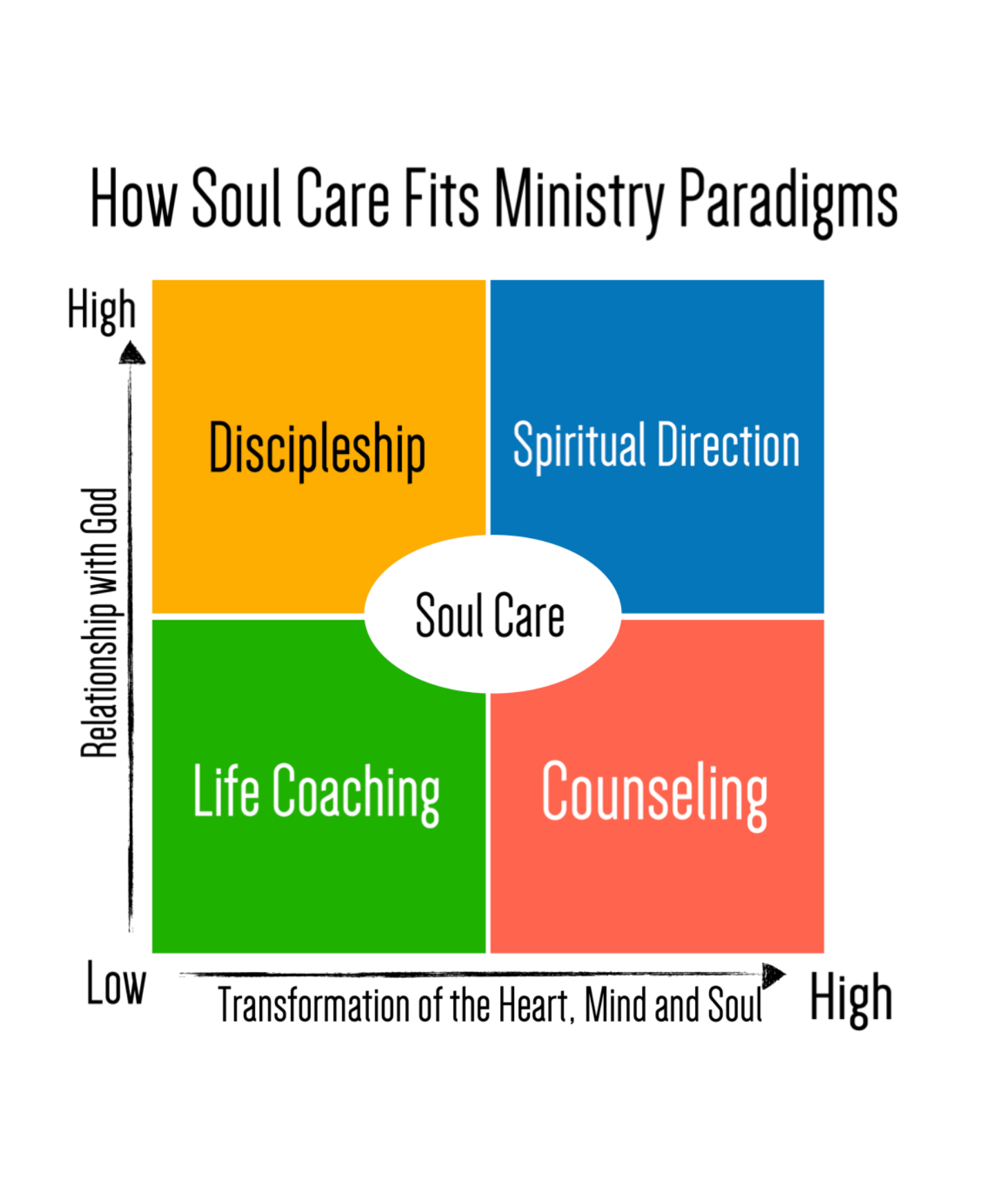 Soul Care is the confluence of all of those disciplines. It is a hybrid of all four. It is not one thing. There is an amazing amount of overlap because it is not just the compassion of Spiritual Direction, it also might be the doctrinal or heteropraxy correction of discipleship. It sometimes is the thinking through a father-wound that goes back decades. It might be coaching through how to resolve a conflict with a church or family member. It might be an extended prayer for healing from past church-wounds or toxic relationships.
